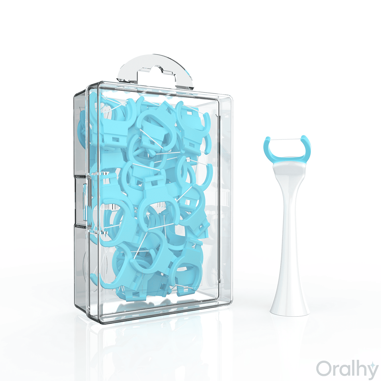 Le pack comprend 50 recharges individuelles (environ 3 mois d’utilisation quotidienne) et 1 support de fil dentaire compatible avec la base motorisée Oralhy.